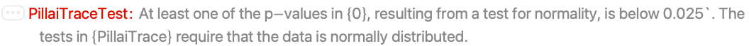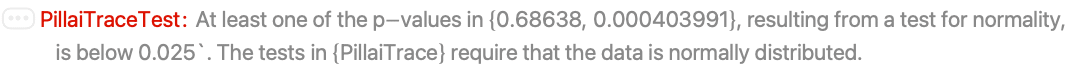 - PillaiTraceTest is based on Pillai's trace statistic computed by PillaiTrace[m1,m2].