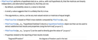 - PillaiTraceTest[m1,m2,"HypothesisTestData"] returns a HypothesisTestData object htd that can be used to extract additional test results and properties using the form htd["property"].