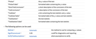-value and test statistic"TestStatistic" the test statistic "TestStatisticTable" formatted table containing the test statistic - The following options can be used: