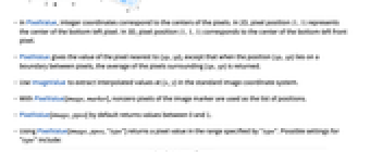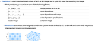corresponds to the center of the bottom-left front pixel. - PixelValue gives the value of the pixel nearest to {xp,yp}, except that when the position {xp,yp} lies on a boundary between pixels, the average of the pixels surrounding {xp,yp} is returned.