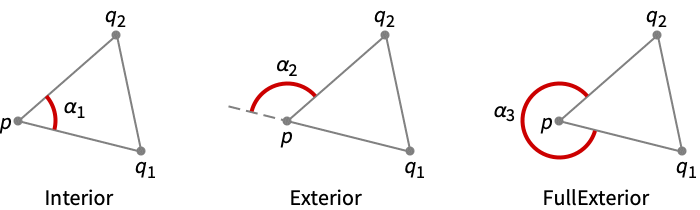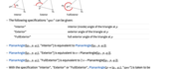 "Interior" interior (inside) angle of the triangle at p "Exterior" exterior angle of the triangle at p "FullExterior" full exterior angle of the triangle at p - PlanarAngle[{q1,p,q2},"Interior"] is equivalent to PlanarAngle[{q1,p,q2}].
