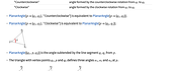 - With the specification "Counterclockwise" or "Clockwise", PlanarAngle[{q1,p,q2},"spec"] is taken to be PlanarAngle[p{q1,q2}, "spec"].