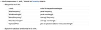 "Color" color of the peak wavelength "MaxFrequency" peak frequency "MaxWavelength" peak wavelength "MeanFrequency" average frequency "MeanWavelength" average wavelength "SpectralPlot" plot of spectral radiance versus wavelength - Spectral radiance is returned in SI units.