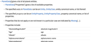 "Entities" all available entities "EntityCount" total number of available entities "Classes" all available entity classes "EntityClassCount" total number of available entity classes "SampleEntities" list of sample entities "SampleEntityClasses" list of sample entity classes "EntityCanonicalNames" list of all entity canonical names "PropertyCanonicalNames" list of all property canonical names "EntityClassCanonicalNames" list of all entity class canonical names "RandomEntities" pseudorandom sample entities {"RandomEntities",n} n pseudorandom entities "RandomEntityClasses" pseudorandom sample entity classes {"RandomEntityClasses",n} n pseudorandom entity classes - The following annotations can be used in the third argument of PlanetData[entity,property,annotation]: