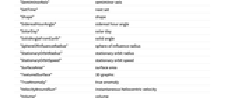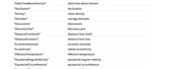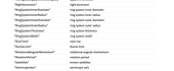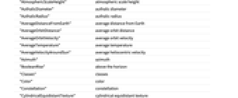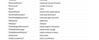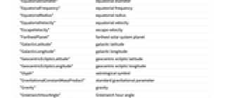 "AtmosphericComposition" atmospheric composition "AtmosphericPressure" atmospheric pressure "AtmosphericScaleHeight" atmospheric scale height "AuthalicDiameter" authalic diameter "AuthalicRadius" authalic radius "AverageDistanceFromEarth" average distance from Earth "AverageOrbitDistance" average orbit distance "AverageOrbitVelocity" average orbit velocity "AverageTemperature" average temperature "AverageVelocityAroundSun" average heliocentric velocity "Azimuth" azimuth "BooleanRise" above the horizon "Classes" classes "Color" color "Constellation" constellation "CylindricalEquidistantTexture" cylindrical equidistant texture "DailyTimeAboveHorizon" daily time above horizon "Declination" declination "Density" mean density "Diameter" average diameter "Discoverers" discoverers "DiscoveryYear" discovery year "DistanceFromEarth" distance from Earth "DistanceFromSun" distance from Sun "EccentricAnomaly" eccentric anomaly "Eccentricity" orbital eccentricity "EffectiveTemperature" effective temperature "EquatorialAngularVelocity" equatorial angular velocity "EquatorialCircumference" equatorial circumference "EquatorialDiameter" equatorial diameter "EquatorialFrequency" equatorial frequency "EquatorialRadius" equatorial radius "EquatorialVelocity" equatorial velocity "EscapeVelocity" escape velocity "FarthestPlanet" farthest solar system planet "GalacticLatitude" galactic latitude "GalacticLongitude" galactic longitude "GeocentricEclipticLatitude" geocentric ecliptic latitude "GeocentricEclipticLongitude" geocentric ecliptic longitude "Glyph" astrological symbol "GravitationalConstantMassProduct" standard gravitational parameter "Gravity" gravity "GreenwichHourAngle" Greenwich hour angle "HeliocentricEclipticLatitude" heliocentric ecliptic latitude "HeliocentricEclipticLongitude" heliocentric ecliptic longitude "HelioCoordinates" heliocentric XYZ coordinates "HillRadius" Hill radius "Inclination" orbital inclination "LocalHourAngle" local hour angle "MajorAxis" major axis "Mass" mass "MaximalAltitudeTime" next maximum altitude time "MaximumTemperature" maximum temperature "MeanAnomaly" mean anomaly "MeanMotion" mean motion "MinimumTemperature" minimum temperature "MinorAxis" minor axis "MomentOfInertia" rotational moment of inertia "MoonCount" number of moons "Name" name "NearestPlanet" nearest solar system planet "NorthPoleDeclination" north pole declination "NorthPoleRightAscension" north pole right ascension "Oblateness" oblateness "Obliquity" obliquity "OrbitalAngularMomentum" orbital angular momentum "OrbitalKineticEnergy" orbital kinetic energy "OrbitalMomentOfInertia" orbital moment of inertia "OrbitCenter" orbit center "OrbitCircumference" orbit circumference "OrbitPath" orbit path "OrbitPeriod" orbital period "OrbitRules" orbit rules "Periapsis" nearest distance from orbit center "PeriapsisArgument" argument of periapsis