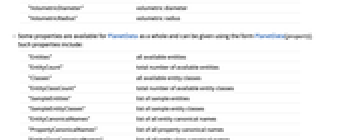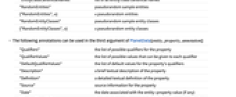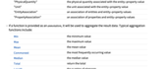 "Qualifiers" the list of possible qualifiers for the property "QualifierValues" the list of possible values that can be given to each qualifier "DefaultQualifierValues" the list of default values for the property's qualifiers "Description" a brief textual description of the property "Definition" a detailed textual definition of the property "Source" source information for the property "Date" the date associated with the entity-property value (if any) "PhysicalQuantity" the physical quantity associated with the entity-property value "Unit" the unit associated with the entity-property value "EntityAssociation" an association of entities and entity-property values "PropertyAssociation" an association of properties and entity-property values - If a function is provided as an annotation, it will be used to aggregate the result data. Typical aggregation functions include: