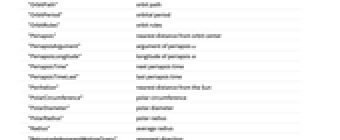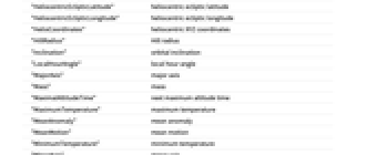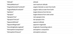 "AbsoluteMagnitudeH" absolute magnitude H "Age" age "Albedo" albedo "AlphanumericName" alphanumeric name "AlternateNames" alternate names "Altitude" altitude "AltitudeMaximum" next maximum altitude "AngularDiameterFromEarth" angular diameter as seen from Earth "AngularRadiusFromEarth" angular radius as seen from Earth "Aphelion" largest distance from the Sun "Apoapsis" largest distance from orbit center "ApoapsisTime" next apoapsis time "ApoapsisTimeLast" last apoapsis time "ApparentAltitude" apparent altitude "ApparentMagnitude" apparent magnitude "AscendingNodeLongitude" longitude of ascending node