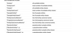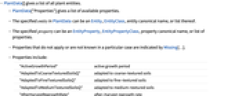 "Entities" all available entities "EntityCount" total number of available entities "Classes" all available entity classes "EntityClassCount" total number of available entity classes "SampleEntities" list of sample entities "SampleEntityClasses" list of sample entity classes "EntityCanonicalNames" list of all entity canonical names "PropertyCanonicalNames" list of all property canonical names "EntityClassCanonicalNames" list of all entity class canonical names "RandomEntities" pseudorandom sample entities {"RandomEntities",n} n pseudorandom entities "RandomEntityClasses" pseudorandom sample entity classes {"RandomEntityClasses",n} n pseudorandom entity classes - The following annotations can be used in the third argument of PlantData[entity,property,annotation]: