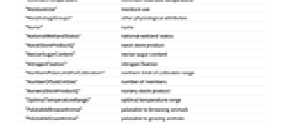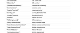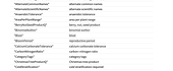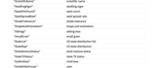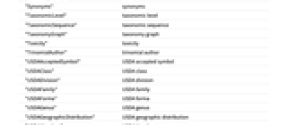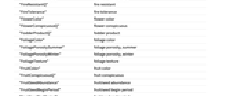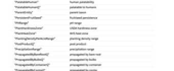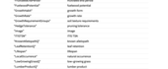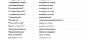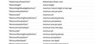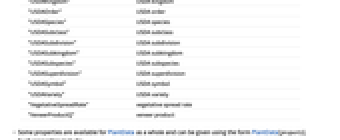 "ActiveGrowthPeriod" active growth period "AdaptedToCoarseTexturedSoilsQ" adapted to coarse-textured soils "AdaptedToFineTexturedSoilsQ" adapted to fine-textured soils "AdaptedToMediumTexturedSoilsQ" adapted to medium-textured soils "AfterHarvestRegrowthRate" after-harvest regrowth rate "AlternateCommonNames" alternate common names "AlternateScientificNames" alternate scientific names "AnaerobicTolerance" anaerobic tolerance "AreaPerPlantRange" area per plant range "BerryNutSeedProductQ" berry, nut, seed product "BinomialAuthor" binomial author "Bloat" bloat "BloomPeriod" reproductive period "CalciumCarbonateTolerance" calcium carbonate tolerance "CarbonNitrogenRatio" carbon-nitrogen ratio "CategoryTags" category tags "ChristmasTreeProductQ" Christmas tree product "ColdStratification" cold stratification required "COLNameCode" COL name code "COLNumber" COL number "CommercialAvailability" commercial availability "CommonName" common name "CoppicePotentialQ" coppice potential "CountryList" country distribution list "DroughtTolerance" drought tolerance "Duration" natural life cycle "FallConspicuousQ" fall conspicuous "FamilyCommonName" family common name "FederalNoxiousCommonName" federal noxious common name "FederalNoxiousStatus" federal noxious status "FederalTEStatus" federal TE status "FertilityRequirement" fertility requirement "FireResistantQ" fire resistant "FireTolerance" fire tolerance "FlowerColor" flower color "FlowerConspicuousQ" flower conspicuous "FodderProductQ" fodder product "FoliageColor" foliage color "FoliagePorositySummer" foliage porosity, summer "FoliagePorosityWinter" foliage porosity, winter "FoliageTexture" foliage texture "FruitColor" fruit color "FruitConspicuousQ" fruit conspicuous "FruitSeedAbundance" fruit/seed abundance "FruitSeedBeginPeriod" fruit/seed begin period "FruitSeedEndPeriod" fruit/seed end period "FuelwoodPotential" fuelwood potential "GrowthHabit" growth form "GrowthRate" growth rate "GrowthRequirementGroups" soil texture requirements "HedgeTolerance" pruning tolerance "Image" image "ITISTSN" ITIS TSN "KnownAllelopathQ" known allelopath "LeafRetentionQ" leaf retention "Lifespan" lifespan "LocalOccurrence" natural occurrence "LowGrowingGrassQ" low-growing grass "LumberProductQ" lumber product "MathematicaFlowerColor" Mathematica flower color "MatureHeight" mature height "MatureHeightBaseAgeMaximum" maximum mature height at base age "MaximumAreaPerPlant" maximum area per plant "MaximumpH" maximum pH "MaximumPlantingDensityPerAcre" maximum planting density "MaximumPrecipitation" maximum precipitation "MinimumAreaPerPlant" minimum area per plant "MinimumFrostFreeDays" minimum frost-free days "MinimumpH" minimum pH "MinimumPlantingDensityPerAcre" minimum planting density "MinimumPrecipitation" minimum precipitation "MinimumRootDepth" minimum root depth "MinimumTemperature" minimum tolerable temperature "MoistureUse" moisture use "MorphologyGroups" other physiological attributes "Name" name "NationalWetlandStatus" national wetland status "NavalStoreProductQ" naval store product "NectarSugarContent" nectar sugar content "NitrogenFixation" nitrogen fixation "NorthernPolarLimitForCultivation" northern limit of cultivable range "NumberOfSubEntities" number of members "NurseryStockProductQ" nursery stock product "OptimalTemperatureRange" optimal temperature range "PalatableBrowseAnimal" palatable to browsing animals "PalatableGrazeAnimal" palatable to grazing animals "PalatableHuman" human palatability "PalatableHumanQ" palatable to humans "ParentEntity" parent taxon "PersistentFruitSeed" fruit/seed persistence "PHRange" pH range "PlantHardinessZone" USDA hardiness zone "PlantHeatZone" AHS heat zone "PlantingDensityPerAcreRange" planting density range "PostProductQ" post product "PrecipitationRange" precipitation range "PropagatedByBareRootQ" propagated by bare root "PropagatedByBulbsQ" propagated by bulbs "PropagatedByContainerQ" propagated by container "PropagatedByCormsQ" propagated by corms "PropagatedByCuttingsQ" propagated by cuttings "PropagatedBySeedQ" propagated by seed "PropagatedBySodQ" propagated by sod "PropagatedBySprigsQ" propagated by sprigs "PropagatedByTubersQ" propagated by tubers "ProteinPotential" protein potential "ProvinceList" Canadian province distribution list "PulpwoodProductQ" pulpwood product "QuadrinomialAuthor" quadrinomial author "RegionalWetlandStatus" regional wetland status "ReproductionGroups" method of propagation "ResproutAbilityQ" resprout ability "SalinityTolerance" salinity tolerance "ScientificName" scientific name "SeedlingVigor" seedling vigor "SeedsPerPound" seed count "SeedSpreadRate" seed spread rate "ShadeTolerance" shade tolerance "ShapeAndOrientation" shape and orientation "Siblings" sibling taxa "SmallGrain" small grain "StateList" US state distribution list "StateMap" US state distribution "StateNoxiousStatus" state noxious status "StateTEStatus" state TE status "SubEntities" child taxa "SuitabilityGroups" uses "Synonyms" synonyms "TaxonomicLevel" taxonomic level "TaxonomicSequence" taxonomic sequence "TaxonomyGraph" taxonomy graph "Toxicity" toxicity "TrinomialAuthor" trinomial author "USDAAcceptedSymbol" USDA accepted symbol "USDAClass" USDA class "USDADivision" USDA division "USDAFamily" USDA family "USDAForma" USDA forma "USDAGenus" USDA genus "USDAGeographicDistribution" USDA geographic distribution "USDAKingdom" USDA kingdom "USDAOrder" USDA order "USDASpecies" USDA species "USDASubclass" USDA subclass "USDASubdivision" USDA subdivision "USDASubkingdom" USDA subkingdom "USDASubspecies" USDA subspecies "USDASuperdivision" USDA superdivision "USDASymbol" USDA symbol "USDAVariety" USDA variety "VegetativeSpreadRate" vegetative spread rate "VeneerProductQ" veneer product - Some properties are available for PlantData as a whole and can be given using the form PlantData[property]. Such properties include: