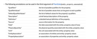 "Qualifiers" the list of possible qualifiers for the property "QualifierValues" the list of possible values that can be given to each qualifier "DefaultQualifierValues" the list of default values for the property's qualifiers "Description" a brief textual description of the property "Definition" a detailed textual definition of the property "Source" source information for the property "Date" the date associated with the entity-property value (if any) "PhysicalQuantity" the physical quantity associated with the entity-property value "Unit" the unit associated with the entity-property value "EntityAssociation" an association of entities and entity-property values "PropertyAssociation" an association of properties and entity-property values - If a function is provided as an annotation, it will be used to aggregate the result data. Typical aggregation functions include:
