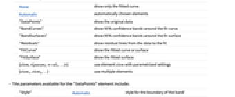 None show only the fitted curve Automatic automatically chosen elements "DataPoints" show the original data "BandCurves" show 95% confidence bands around the fit curve "BandSurfaces" show 95% confidence bands around the fit surface "Residuals" show residual lines from the data to the fit "FitCurve" show the fitted curve or surface "FitSurface" show the fitted surface {elem,<|param1val1,…|>} use element elem with parametrized settings {elem1,elem2,…} use multiple elements - The parameters available for the "DataPoints" element include: