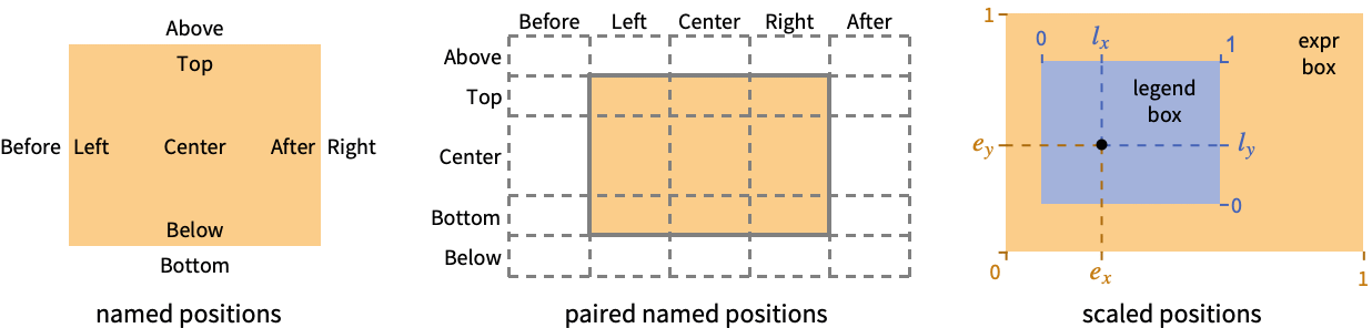 Above,Below,Before,After positions outside the bounding box for expr {h,v} horizontal h and vertical positions v {{ex,ey},{lx,ly}} scaled position {lx,ly} in the legend at scaled position {ex,ey} in expr - Possible horizontal positions include Before, Left, Center, Right and After.