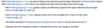 - With PlotRangeClipping->True, graphics objects are effectively clipped to the region defined by the rectangle from Scaled[{0,0}] to Scaled[{1,1}].