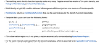 PointDensityFunction HistogramPointDensity SmoothPointDensity InhomogeneousPoissonPointProcess SpatialPointData HistogramDistribution GeoHistogram GeoSmoothHistogram DensityHistogram SmoothDensityHistogram SmoothKernelDistribution KernelMixtureDistribution HistogramList Histogram Histogram3D VoronoiMesh