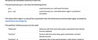 proc a point process proc with exact formulas {proc,reg} a point process proc and observation region reg based on simulation - The observation region reg should be a parameter-free, full-dimensional and bounded region as tested by SpatialObservationRegionQ.