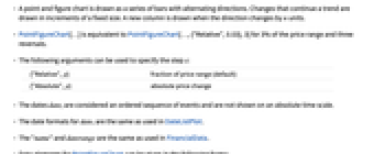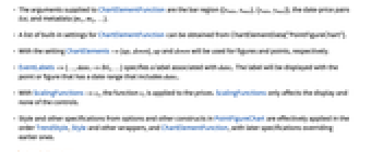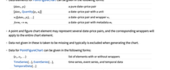 {datei,pi} a pure date-price pair {datei,Quantity[pi,ui]} a date-price pair with a unit wi[{datei,pi},…] a date-price pair and wrapper wi formi->mi a date-price pair with metadata mi - A point and figure chart element may represent several date-price pairs, and the corresponding wrappers will apply to the entire chart element.