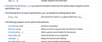 {e1,e2,…} list of elements with or without wrappers TimeSeries[…],EventSeries[…],TemporalData[…] time series, event series, and temporal data w[{e1,e2,…}] wrapper applied to the whole data - PointFigureChart[Tabular[…]cspec] extracts and plots values from the tabular object using the column specification cspec.