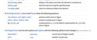 Top,Bottom,Left,Right,Center positions within point or figure Above, Below, Before, After positions outside point or figure {{bx,by},{lx,ly}} scaled position {lx,ly} in the label at scaled position {bx,by} in the point or figure - PointFigureChart has the same options as Graphics with the following additions and changes: [List of all options]