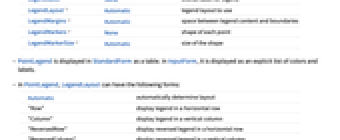 Joined False whether to draw a joined line with the points LabelStyle Automatic style to use for labels LegendFunction Identity wrapper for the overall legend LegendLabel None overall label for legend LegendLayout Automatic legend layout to use LegendMargins Automatic space between legend content and boundaries LegendMarkers None shape of each point LegendMarkerSize Automatic size of the shape - PointLegend is displayed in StandardForm as a table. In InputForm, it is displayed as an explicit list of colors and labels.