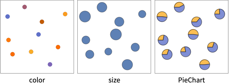 "Size" vary the point sizes according to the values "Color" smoothly color the points according to the values "DiscreteColor" discretely color the points according to the values "Shape" vary the shape of the point according to the values "Label" label the points with the values func apply func to the values to determine the point marker nenc encode the n