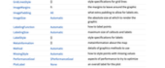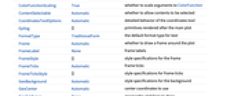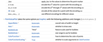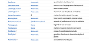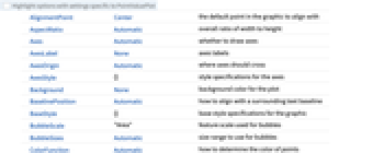 AlignmentPoint Center the default point in the graphic to align with AspectRatio Automatic overall ratio of width to height Axes Automatic whether to draw axes AxesLabel None axes labels AxesOrigin Automatic where axes should cross AxesStyle {} style specifications for the axes Background None background color for the plot BaselinePosition Automatic how to align with a surrounding text baseline BaseStyle {} base style specifications for the graphic BubbleScale "Area" feature scale used for bubbles BubbleSizes Automatic size range to use for bubbles ColorFunction Automatic how to determine the color of points ColorFunctionScaling True whether to scale arguments to ColorFunction ContentSelectable Automatic whether to allow contents to be selected CoordinatesToolOptions Automatic detailed behavior of the coordinates tool Epilog {} primitives rendered after the main plot FormatType TraditionalForm the default format type for text Frame Automatic whether to draw a frame around the plot FrameLabel None frame labels FrameStyle {} style specifications for the frame FrameTicks Automatic frame ticks FrameTicksStyle {} style specifications for frame ticks GeoBackground Automatic style specifications for the background GeoCenter Automatic center coordinates to use GeoGridLines None geographic grid lines to draw GeoGridLinesStyle Automatic style specifications for geographic grid lines GeoGridRange All projected coordinate range to include GeoGridRangePadding Automatic how much to pad the projected range GeoModel Automatic model of the Earth (or other body) to use GeoProjection Automatic projection to use GeoRange Automatic geographic area range to include GeoRangePadding Automatic how much to pad the geographic range GeoResolution Automatic average distance between background pixels GeoScaleBar None scale bar to display GeoServer Automatic specification of a tile server GeoZoomLevel Automatic zoom to use for geographic background GridLines None grid lines to draw GridLinesStyle {} style specifications for grid lines ImageMargins 0. the margins to leave around the graphic ImagePadding All what extra padding to allow for labels etc. ImageSize Automatic the absolute size at which to render the graphic LabelingFunction Automatic how to label points LabelingSize Automatic maximum size of callouts and labels LabelStyle {} style specifications for labels MetaInformation {} metainformation about the map Method Automatic details of graphics methods to use MissingStyle Automatic how to style points with missing values PerformanceGoal $PerformanceGoal aspects of performance to try to optimize PlotLabel None an overall label for the plot PlotLegends None legends to use for data PlotMarkers None markers to use to indicate each point PlotRange Automatic range of coordinates to include PlotRangeClipping False whether to clip at the plot range PlotRangePadding Automatic how much to pad the range of values PlotRegion Automatic the final display region to be filled PlotStyle Automatic graphics directives to determine styles of points PlotTheme Automatic overall theme for the plot PreserveImageOptions Automatic whether to preserve image options when displaying new versions of the same graphic Prolog {} primitives rendered before the main plot RasterSize Automatic raster dimensions for the background data RotateLabel True whether to rotate y labels on the frame ScalingFunctions None how to scale individual coordinates TargetUnits Automatic units to display in the plot Ticks Automatic axes ticks TicksStyle {} style specifications for axes ticks