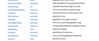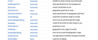 AspectRatio Automatic overall ratio of width to height Axes Automatic whether to draw axes BubbleScale "Area" feature scale used for bubbles BubbleSizes Automatic size range to use for bubbles ColorFunction Automatic how to determine the color of points ColorFunctionScaling True whether to scale arguments to ColorFunction Frame Automatic whether to draw a frame around the plot GeoBackground Automatic style specifications for the background GeoCenter Automatic center coordinates to use GeoGridLines None geographic grid lines to draw GeoGridLinesStyle Automatic style specifications for geographic grid lines GeoGridRange All projected coordinate range to include GeoGridRangePadding Automatic how much to pad the projected range GeoModel Automatic model of the Earth (or other body) to use GeoProjection Automatic projection to use GeoRange Automatic geographic area range to include GeoRangePadding Automatic how much to pad the geographic range GeoResolution Automatic average distance between background pixels GeoScaleBar None scale bar to display GeoServer Automatic specification of a tile server GeoZoomLevel Automatic zoom to use for geographic background LabelingFunction Automatic how to label points LabelingSize Automatic maximum size of callouts and labels MetaInformation {} metainformation about the map MissingStyle Automatic how to style points with missing values PerformanceGoal $PerformanceGoal aspects of performance to try to optimize PlotLegends None legends to use for data PlotMarkers None markers to use to indicate each point PlotRange Automatic range of coordinates to include PlotStyle Automatic graphics directives to determine styles of points PlotTheme Automatic overall theme for the plot RasterSize Automatic raster dimensions for the background data ScalingFunctions None how to scale individual coordinates TargetUnits Automatic units to display in the plot -