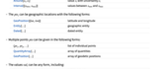 GeoPosition[{lat,lon}] latitude and longitude Entity[…] geographic entity Dated[…] dated entity - Multiple points pts can be given in the following forms: