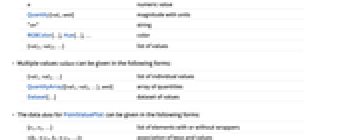 n numeric value Quantity[vali,unit] magnitude with units "str" string RGBColor[…],Hue[…],… color {vali1,vali2,…} list of values - Multiple values values can be given in the following forms: