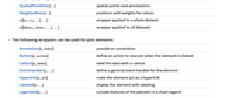 {e1,e2,…} list of elements with or without wrappers <|k1e1,k2e2,…|> association of keys and values SpatialPointData[…] spatial points and annotations WeightedData[…] positions with weights for values w[{e1,e2,…},…] wrapper applied to a whole dataset w[{data1,data1,…},…] wrapper applied to all datasets - The following wrappers can be used for plot elements: