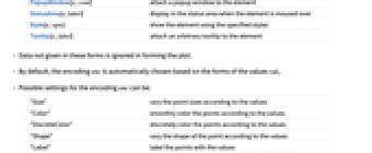 Annotation[e,label] provide an annotation Button[e,action] define an action to execute when the element is clicked Callout[e,label] label the data with a callout EventHandler[e,…] define a general event handler for the element Hyperlink[e,uri] make the element act as a hyperlink Labeled[e,…] display the element with labeling Legended[e,…] include features of the element in a chart legend PopupWindow[e,cont] attach a popup window to the element StatusArea[e,label] display in the status area when the element is moused over Style[e,opts] show the element using the specified styles Tooltip[e,label] attach an arbitrary tooltip to the element - Data not given in these forms is ignored in forming the plot.