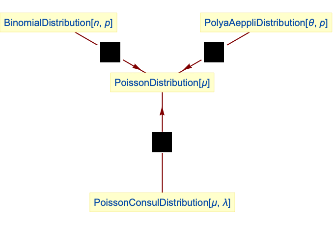 - PoissonDistribution is related to a number of other statistical distributions. It is generalized by PoissonConsulDistribution in the sense that the PDF of PoissonDistribution[μ] is precisely that of PoissonConsulDistribution[μ,0]. Moreover, PoissonDistribution is a limiting case for both BinomialDistribution and PolyaAeppliDistribution in the sense that the PDF of BinomialDistribution[n,μ/n] as n→∞ is precisely the same as the PDF of PoissonDistribution[μ], while the PDF for PolyaAeppliDistribution[θ,p] tends to that of PoissonDistribution[θ] as p→0. PoissonDistribution is also related to NegativeBinomialDistribution, GammaDistribution, GeometricDistribution, ExponentialDistribution, BorelTannerDistribution, BinomialDistribution, NegativeMultinomialDistribution, and MultinomialDistribution.