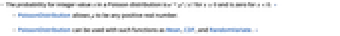 - PoissonDistribution[μ] represents a discrete statistical distribution defined for integer values