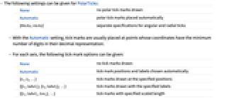 None no polar tick marks drawn Automatic polar tick marks placed automatically {θticks,rticks} separate specifications for angular and radial ticks - With the Automatic setting, tick marks are usually placed at points whose coordinates have the minimum number of digits in their decimal representation.