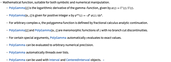 - PolyGamma[z] and PolyGamma[n,z] are meromorphic functions of z with no branch cut discontinuities.