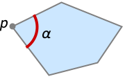 - PolygonAngle[poly, p] gives the angle delimited by the two adjacent sides intersecting at p.