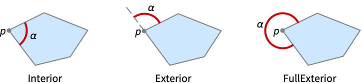 "Interior" interior (inside) angle at p "Exterior" exterior angle at p "FullExterior" full exterior angle at p - PolygonAngle[poly,p,"Interior"] is equivalent to PolygonAngle[poly,p].