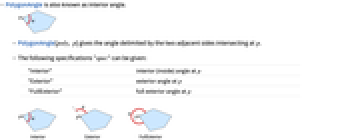 - PolygonAngle[poly,p,"Exterior"] is equivalent to π-PolygonAngle[poly,p].