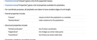"Classes" classes of which the polyhedron is a member "NotationRules" index notations for the polyhedron - Structural properties include: