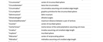 "Centroid" coordinates of the centroid in the standard embedding "Circumcenter" center of circumscribed sphere "Circumdiameter" twice the circumradius "Circumradius" circumradius assuming unit smallest edge length "Circumsphere" graphics primitive for the circumscribed sphere "DehnInvariant" Dehn invariant "DihedralAngles" dihedral angles "GeneralizedDiameter" maximum distance between a pair of vertices "Incenter" center of inscribed sphere "InertiaTensor" inertia tensor of the solid polyhedron assuming unit mass "Inradius" inradius assuming unit smallest edge length "Insphere" inscribed sphere "Midcenter" center of reciprocating sphere "Midradius" midradius assuming unit smallest edge length "Midsphere" graphics primitive for the reciprocating sphere "StableFaces" stable faces "SurfaceArea" total surface area assuming unit smallest edge length "UnstableFaces" unstable faces "VertexSubsetHulls" rules for vertices whose hulls form other solids "Volume" enclosed volume assuming unit smallest edge length - Average length properties include:
