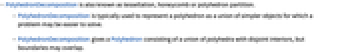 - PolyhedronDecomposition is typically used to represent a polyhedron as a union of simpler objects for which a problem may be easier to solve.