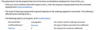 - If the polyi form a Gröbner basis with respect to the xi, then this property uniquely determines the remainder obtained from PolynomialReduce.