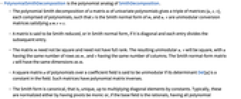 - PolynomialSmithDecomposition is the polynomial analog of SmithDecomposition.
