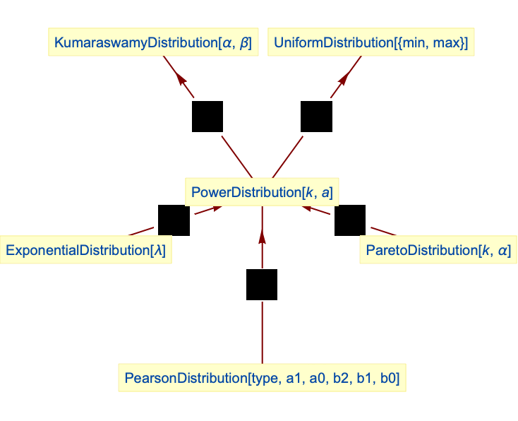 - PowerDistribution is related to a number of other distributions. PowerDistribution is related to both KumaraswamyDistribution and PearsonDistribution in the sense that the PDF of PowerDistribution[1,α] is precisely equivalent to that of KumaraswamyDistribution[α,1] and PearsonDistribution[1,1-α,α-1,1,-1,0]. Moreover, PowerDistribution is a transformation (TransformedDistribution) of both ExponentialDistribution and ParetoDistribution as the PDF of PowerDistribution[k,α] is the same as the PDF of