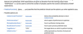 "Decision" best prediction according to the distribution and the utility function "Distribution" distribution of value conditioned on input "SHAPValues" Shapley additive feature explanations for each example "Properties" list of all properties available - "SHAPValues" assesses the contribution of features by comparing predictions with different sets of features removed and then synthesized. The option MissingValueSynthesis can be used to specify how the missing features are synthesized. SHAP explanations are given as deviation from the training output mean. "SHAPValues"n can be used to control the number of samples used for the numeric estimations of SHAP explanations.
