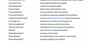 "BatchEvaluationTime" marginal time to predict one example when a batch is given "EvaluationTime" time needed to predict one example "ExampleNumber" number of training examples "FeatureTypes" feature types of the predictor input "FunctionMemory" memory needed to store the predictor "FunctionProperties" all prediction properties available for this predictor "IndeterminateThreshold" value of IndeterminateThreshold used by the predictor "LearningCurve" performance as function of training set size "MaxTrainingMemory" maximum memory used during training "MeanCrossEntropy" estimated mean cross entropy of the predictor "Method" value of Method used by the predictor "MethodDescription" summary of the method "MethodOption" full method option to be reused in a new training "MethodParameters" parameter settings of the method "Properties" all information properties available for this predictor "StandardDeviation" estimated standard deviation of the predictor "FeatureExtractor" feature extractor as FeatureExtractorFunction "TrainingLabelMean" mean label value seen during training "TrainingTime" time used by Predict to generate the predictor "UtilityFunction" value of UtilityFunction used by the predictor - Information properties also include all method suboptions.