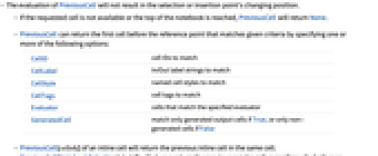 - If the requested cell is not available or the top of the notebook is reached, PreviousCell will return None.