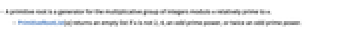 - A primitive root is a generator for the multiplicative group of integers modulo n relatively prime to n.