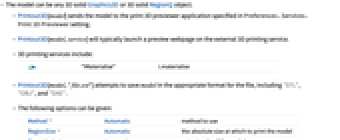 Method Automatic method to use RegionSize Automatic the absolute size at which to print the model TargetUnits Automatic output units of the model Printout3DPreviewer $Printout3DPreviewer 3D print previewer to launch - Printout3D[model] will automatically call the previewer specified by Printout3DPreviewer.