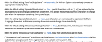"FontPostScriptName" Automatic the name of the closest equivalent PostScript font for a given Wolfram System font "OperatorSubstitution" True whether a certain set of characters should be automatically replaced by equivalent Wolfram System characters when entered "WindowsUseTrueTypeNames" True whether a predefined set of font replacement rules are applied (Windows only) - In the Wolfram System, each characteristic of a font is specified by a separate option such as FontFamily, FontWeight, or FontSlant. At the time of printing, this information is used to select the closest equivalent PostScript font (e.g. "Times-BoldItalic"). Occasionally, the selected font may be different from the one you intended, due to the lack of a uniform naming convention for PostScript fonts. In such cases you can explicitly specify the name of the font to be used.