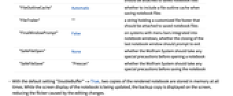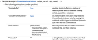 "DoubleBuffer" True whether double buffering, a method of reducing flicker while a notebook is being edited, is used for a notebook "ExcludeFromShutdown" False on platforms with menu bars integrated into the notebook windows, whether closing this notebook might trigger the Wolfram System to quit if it is the last such notebook "FileContents" {"FileLeader","StandardFileLeader","NotebookData","StandardFileTrailer","FileTrailer"} the components that should be saved out to a notebook file, and their ordering "FileLeader" "" a string holding a customized file header that should be attached to saved notebook files "FileOutlineCache" Automatic whether to include a file outline cache when saving notebook files "FileTrailer" "" a string holding a customized file footer that should be attached to saved notebook files "FinalWindowPrompt" False on systems with menu bars integrated into notebook windows, whether the closing of the last notebook window should prompt to exit "SafeFileOpen" None whether the Wolfram System should take any special precautions before opening a notebook "SafeFileSave" "Prescan" whether the Wolfram System should take any special precautions before saving the notebook - With the default setting "DoubleBuffer"->True, two copies of the rendered notebook are stored in memory at all times. While the screen display of the notebook is being updated, the backup copy is displayed on the screen, reducing the flicker caused by the editing changes.